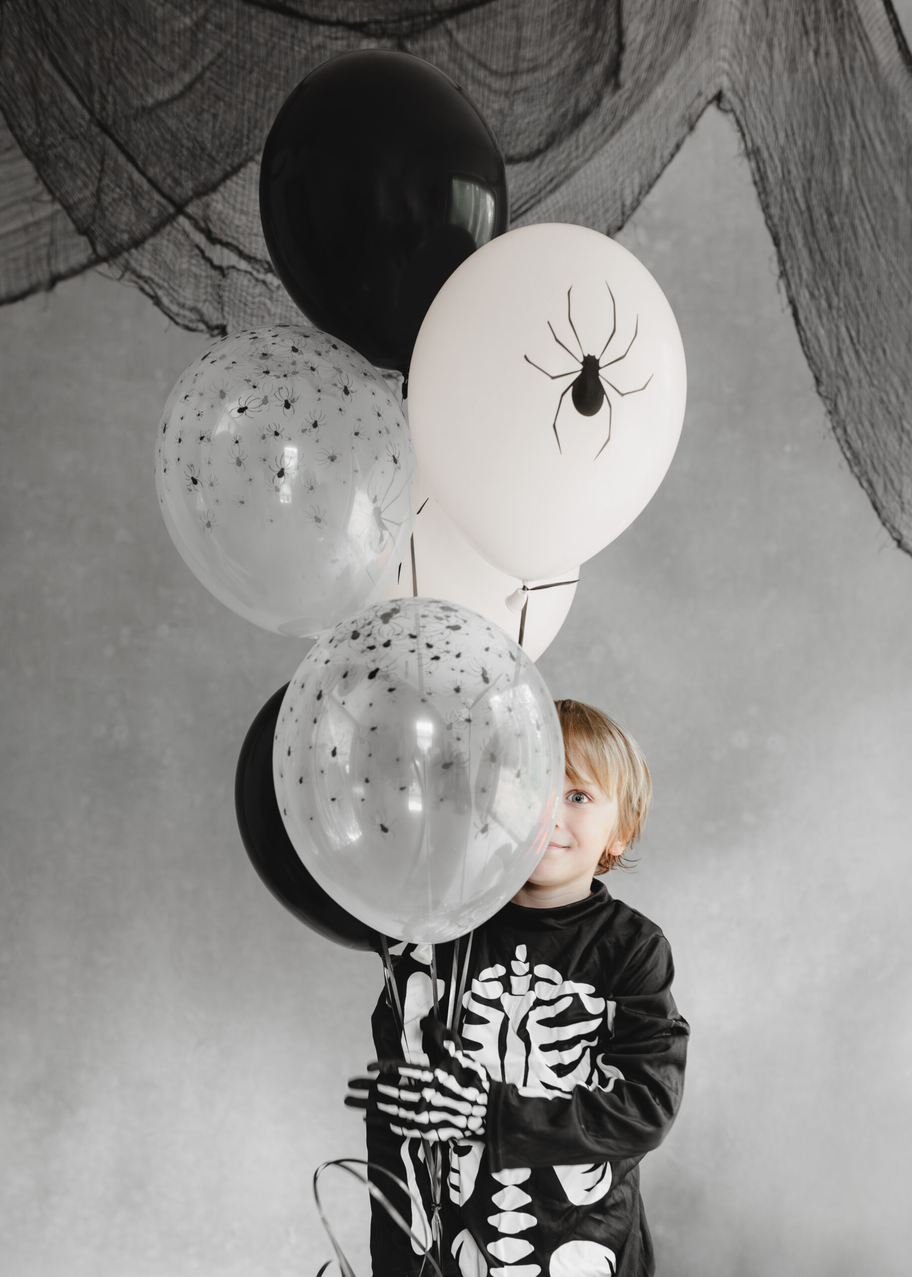 Ce lot combine des ballons pastel off-white, crystal clear et noirs pastel avec des impressions araignées, parfaits pour créer une ambiance spooky mais élégante. Idéal pour surprendre sans surcharger la déco.