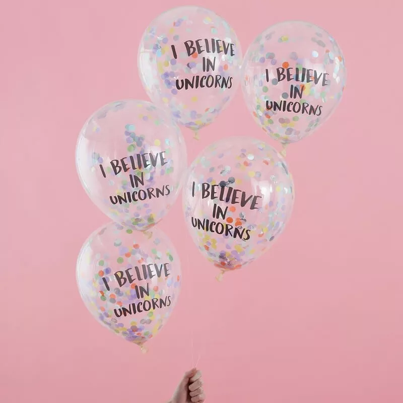 5 ballons transparents remplis de confettis pastels avec l’inscription I believe in Unicorns, parfaitvpour un anniversaire Licorne ou simplement comme cadeau pour une fan de Licorne.